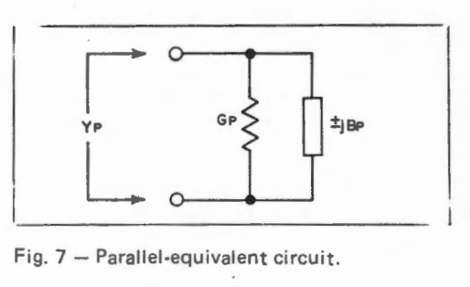 Где Yn представляет нормализованную проводимость, а Ya — системную проводимость (1/50 или 0.02 в данном случае). Из этого комбинированная проводимость C1 и Zg равна 1.0+jBP миллисименс, где Bp представляет ёмкостную восприимчивость C1, также показанную на рис. 10B.